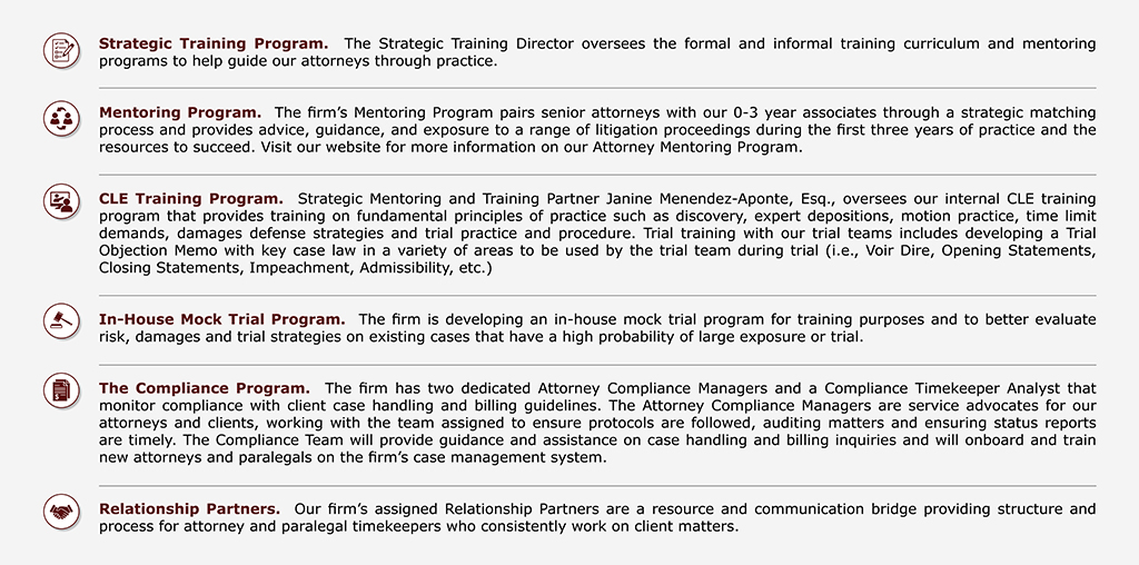 The firm offers in-house training programming on a regular and ongoing basis and has a formal Mentoring Program to help guide our junior attorneys through practice. The training curricula addresses topics such as discovery, expert depositions, time limit demands and damages defense strategies and includes an in-house mock trial program to assist attorneys in evaluating risk, damages and trial strategies on existing cases that have a high probability of large exposure or trial.